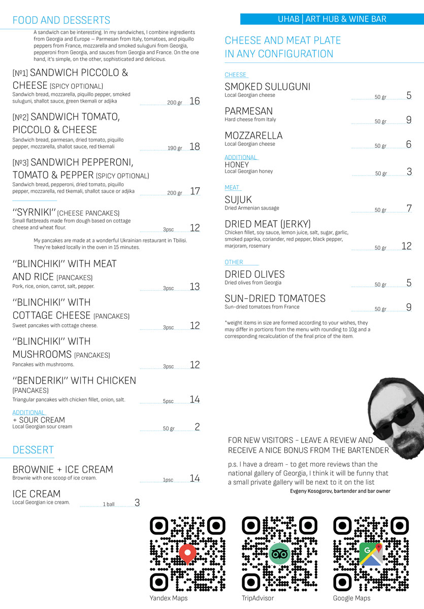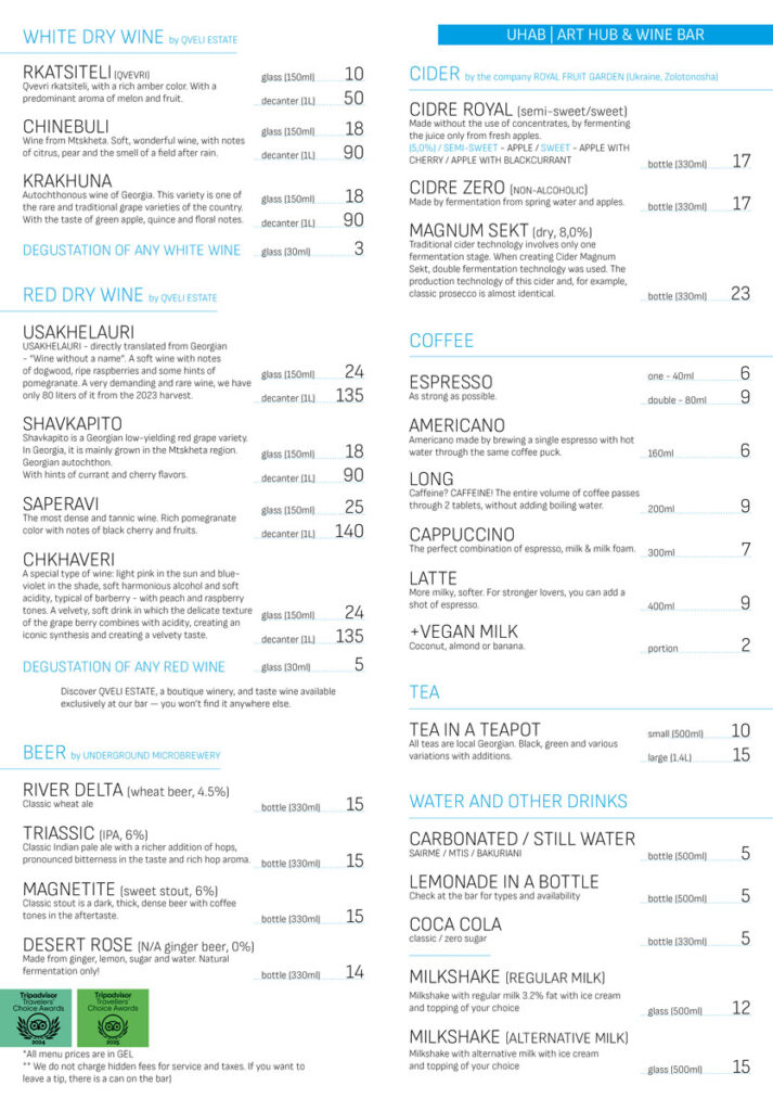My bar is about the aesthetics of taste and cool people, it’s music, dating, board games, lectures, art lessons. My menu is a combination of products from Georgia, Armenia, France, Belgium and Italy. My wine is from the local small winery Qveli Estate, unique, very good quality, for example, our Saperavi recently took silver at the Georgian wine festival. And you can try this wine only here, these are mutually exclusive conditions, my winemaker works only with me, and I only take his wine. My bar is my art, a combination of taste and atmosphere. My bar is people, wonderful people from all over the planet.