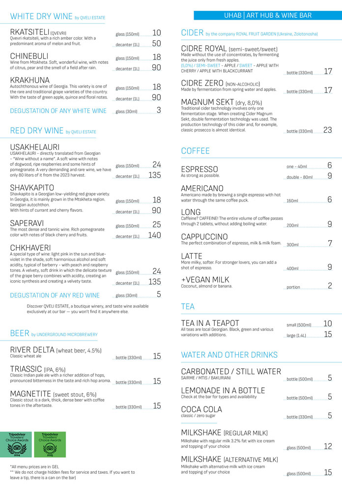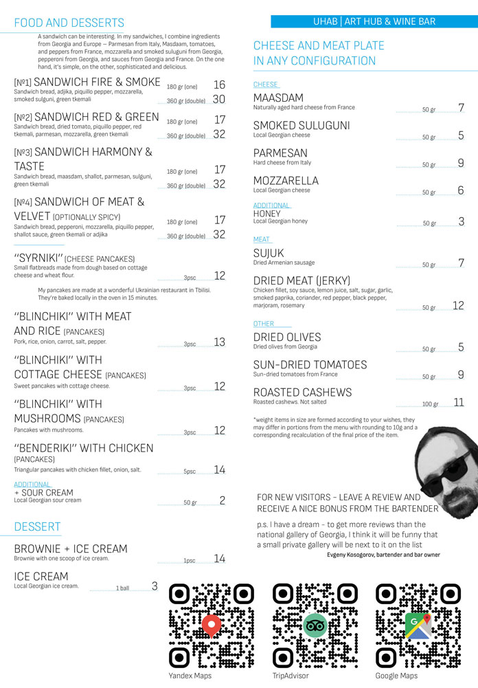 My bar is about the aesthetics of taste and cool people, it’s music, dating, board games, lectures, art lessons. My menu is a combination of products from Georgia, Armenia, France, Belgium and Italy. My wine is from the local small winery Qveli Estate, unique, very good quality, for example, our Saperavi recently took silver at the Georgian wine festival. And you can try this wine only here, these are mutually exclusive conditions, my winemaker works only with me, and I only take his wine. My bar is my art, a combination of taste and atmosphere. My bar is people, wonderful people from all over the planet.